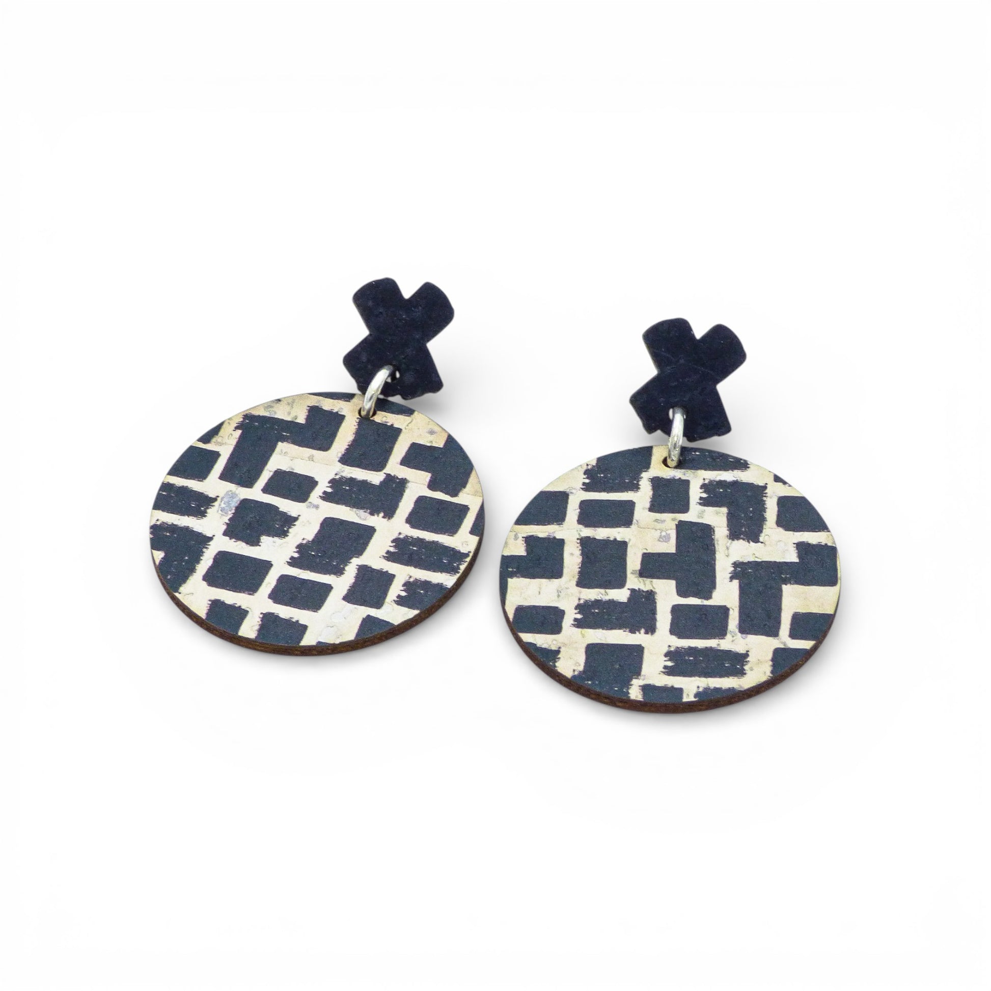 Design Géométrique : Le modèle se compose d'un disque principal orné d'un motif abstrait noir et blanc, rappelant un labyrinthe ou un pavage irrégulier. Ce motif contraste avec la partie supérieure (le clou) qui prend la forme d'une croix ("X") en liège noir uni.