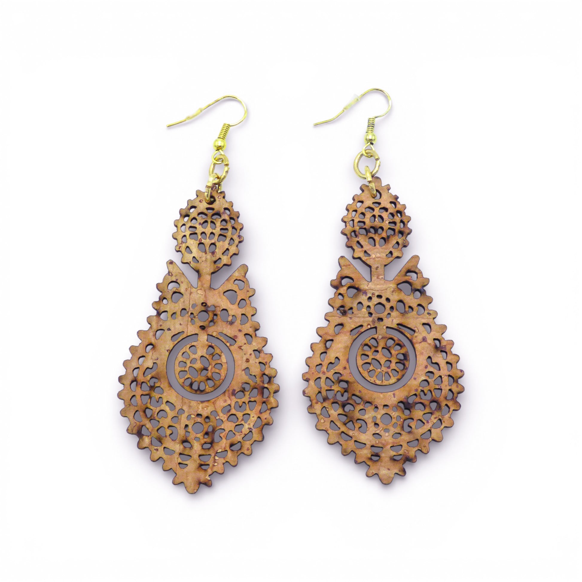 Découpe Laser Fine : Toute la surface du liège est ajourée de motifs géométriques et floraux (arabesques). Ces perforations rendent le bijou visuellement très léger et laissent passer la lumière à travers la matière.
