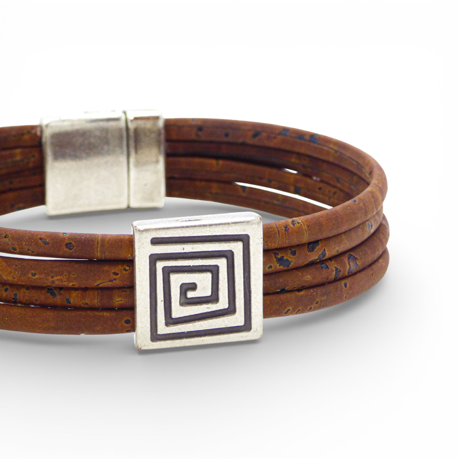 L'élégance intemporelle d'un symbole antique. Ce bracelet joue la carte de la sophistication avec sa structure en triple rang. Les trois cordons de liège plat sont rehaussés par un passant central orné d'un motif "Grecque" (Méandre), symbole d'infini et d'harmonie. Un bijou qui habille le poignet avec présence tout en restant incroyablement léger.